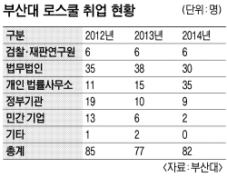 지난 3년 동안 변호사시험에 합격한 부산대 법학전문대학원(로스쿨) 졸업생들의 취업률은 90%가 넘는 것으로 나타났다.부산대 로스쿨 졸업생들 역시 김&장, 태평양, 율촌 등 국내 상위 10대 로펌을 포함한 법무법인에 가장 많이 진출했다.